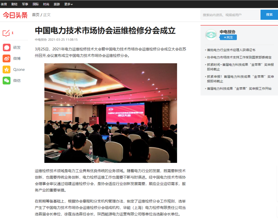 3月25日,2021年電力運(yùn)維檢修技術(shù)大會暨中國電力技術(shù)市場協(xié)會運(yùn)維檢修分會成立大會在蘇州召開,會議宣布成立中國電力技術(shù)市場協(xié)會運(yùn)維檢修分會。