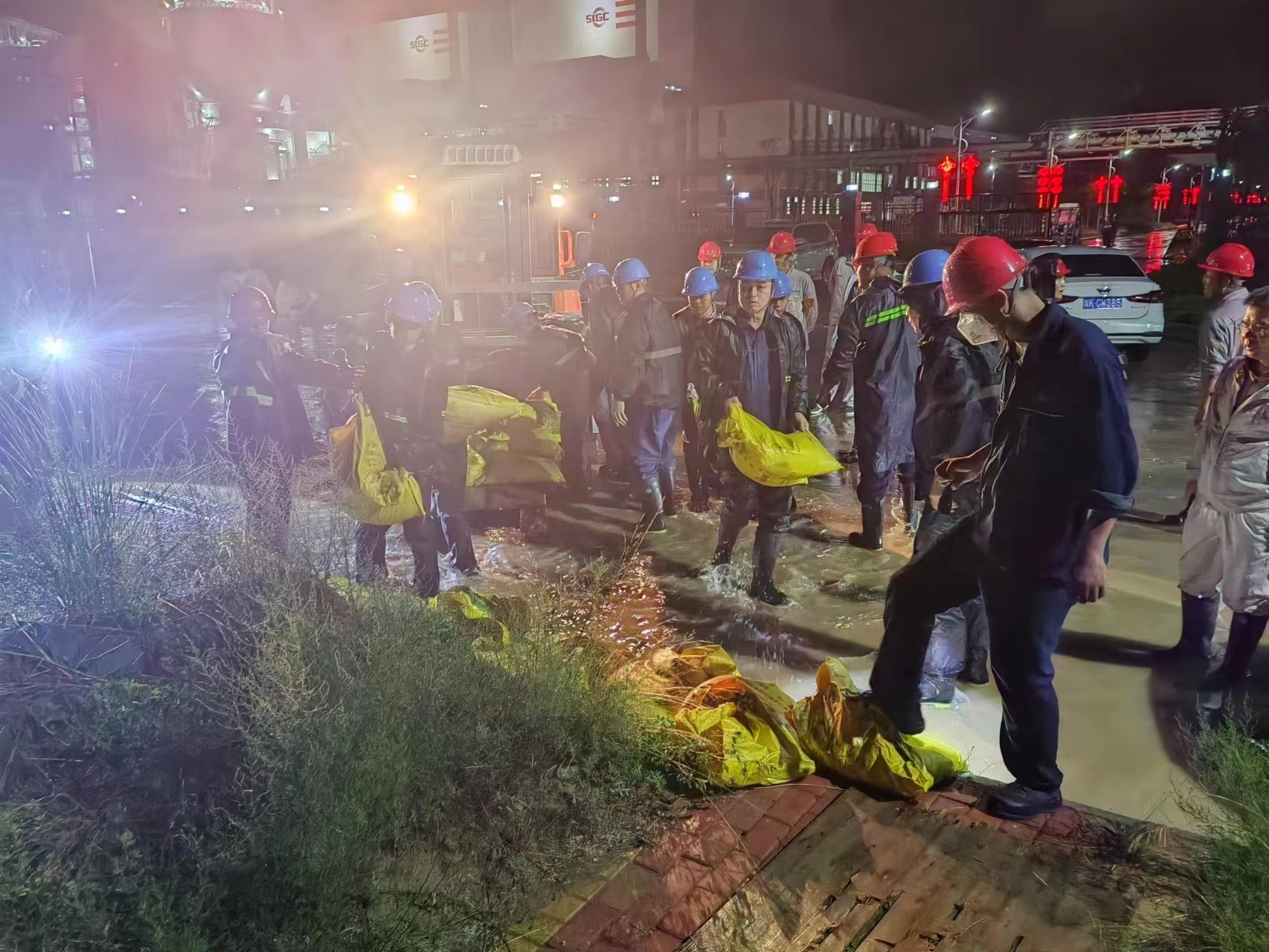 下午18時許,狂風(fēng)大作,天空下起小雨。值班和管理人員立即開始巡查。21:30,大雨滂沱,防汛應(yīng)急人員全員進入現(xiàn)場搶險。此時,檢修樓前路面積水成河,雨水已沒過了腳面。由于雨量過大,全廠的雨水都匯聚到了西門外,排水渠的積水也越來越深,甚至有倒灌回廠區(qū)的情況發(fā)生。搶險人員立即清理排水渠內(nèi)雜物,確保排水通暢。搬運沙袋圍檔堵住西門通道,形成防洪堤壩,防止雨水倒灌。在項目部有序組織協(xié)調(diào)下,汛情快速得到控制。