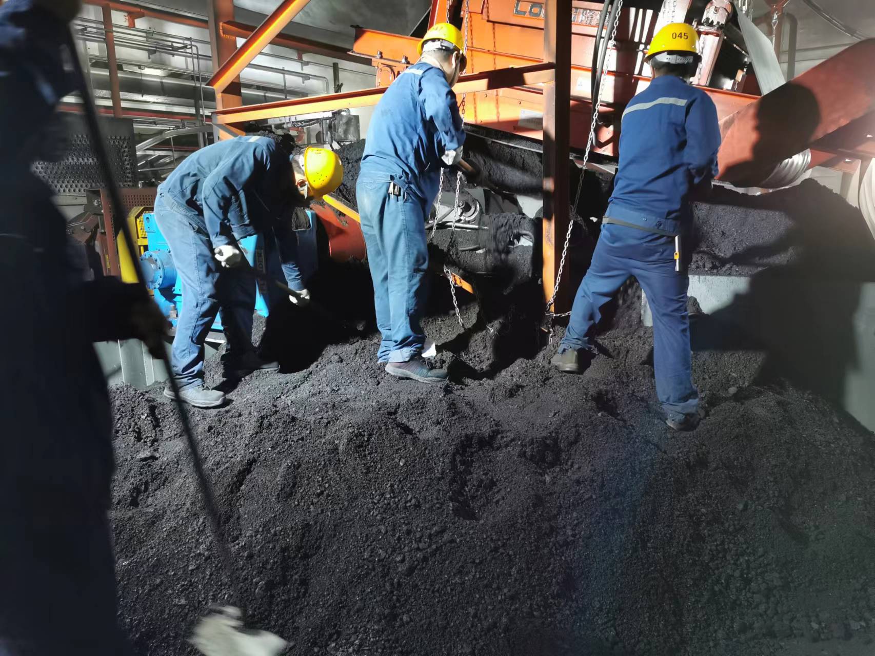 時間緊、任務(wù)急,在積煤最嚴(yán)重的#7帶拉緊小室,所有隊員面對堆積如小山的濕煤,齊心協(xié)力、配合默契,揮動著鍬鎬,爭分奪秒裝運(yùn)積煤。有的積煤雖然沒那么濕,粘性卻很大,一鍬下去根本鏟不動,只能分割成“豆腐塊”逐一處理,最難對付的還是堆積在設(shè)備下部的積煤,大家直不起腰、發(fā)不上力,清理起來極為困難,只能用最原始的方式一鍬一鍬清理。30多度高溫使得運(yùn)行車間內(nèi)愈加悶熱,不一會兒人人大汗淋漓、手上磨起水泡,汗水浸透工衣,“煤山”也以肉眼可見的速度逐漸變小。經(jīng)過40小時的連續(xù)奮戰(zhàn),輸煤系統(tǒng)恢復(fù)正常運(yùn)行。